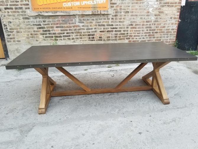 Salvaged Wood X Base W Riveted 96 Inch Stainless Steel Top