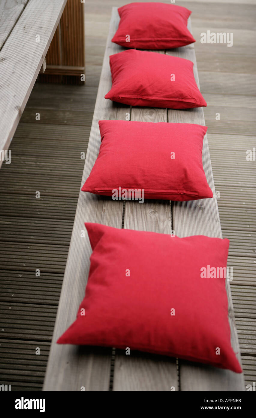 Four Red Colored Pillows Arranged On A Wooden Bench Stock Photo