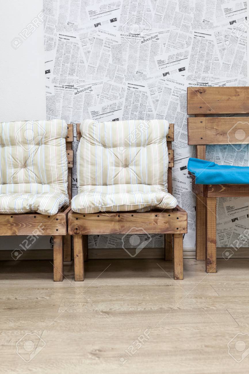 Wooden Hand Made Chairs And Bench With Soft Pillows Room Interior