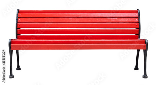 Colorful Wooden Bench Painted In Red With Metal Legs Isolated On