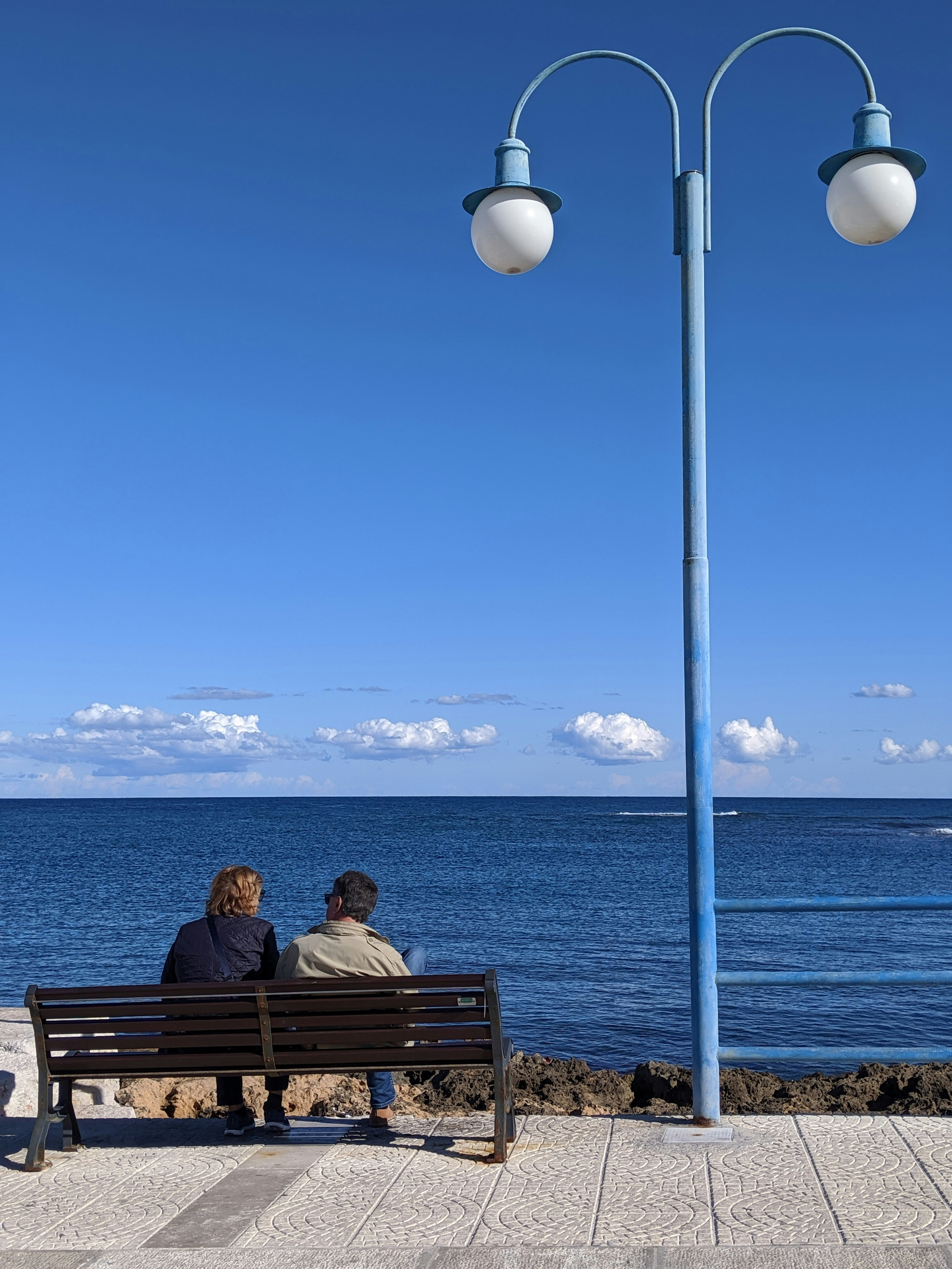 Two Person Sitting On Bench Beside Blue Lamp Post Photo Free