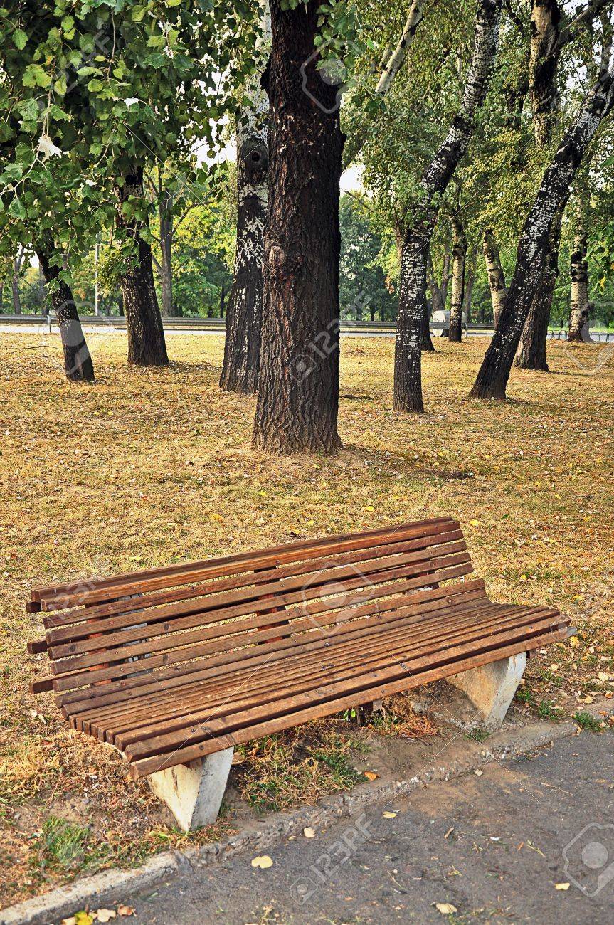 A Vacant Park Bench On A Cloudy Afternoon Autumn Scenery Stock