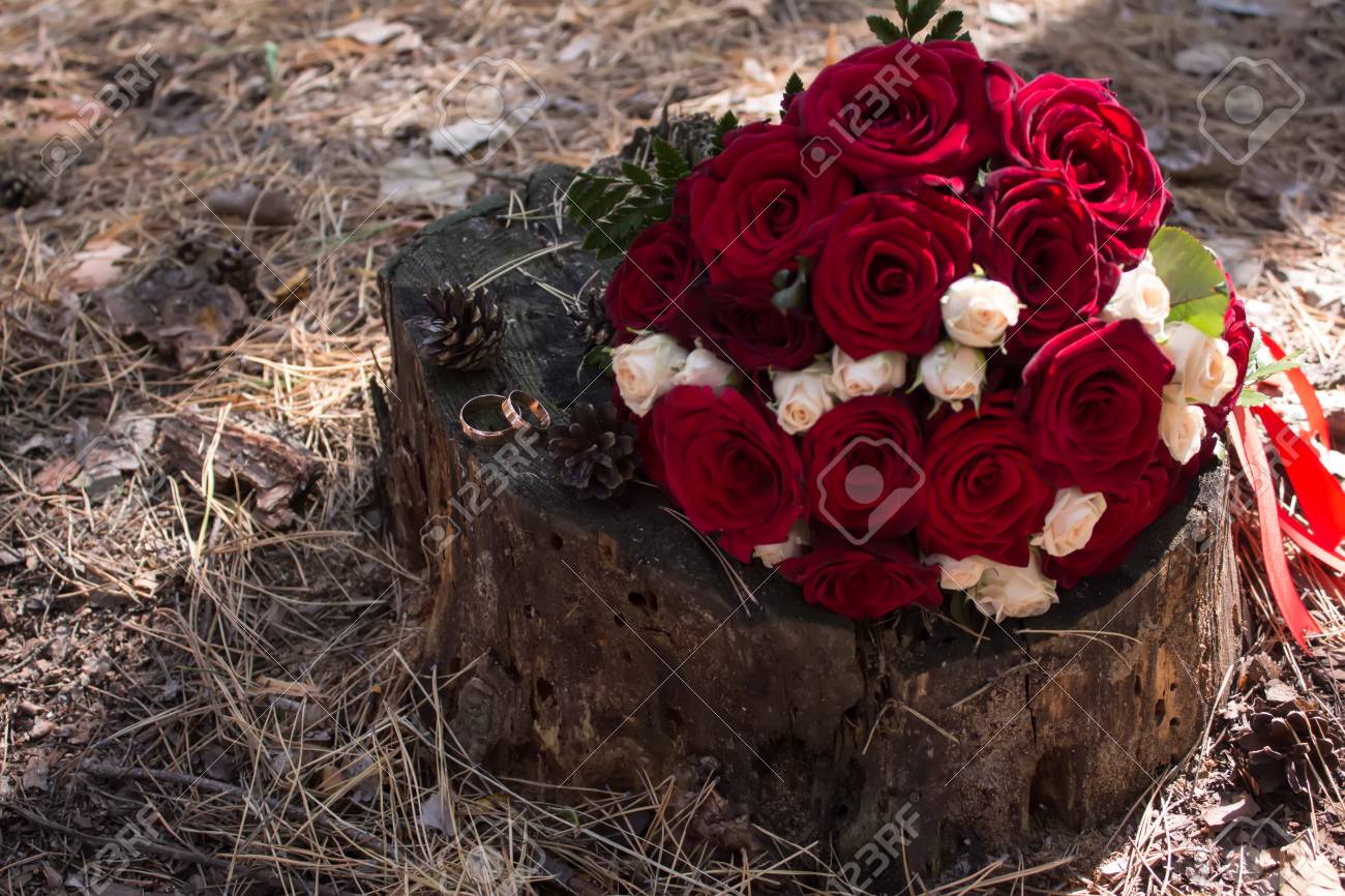 Wedding Bouquet Of Flowers Lying On A Bench On A Blurred