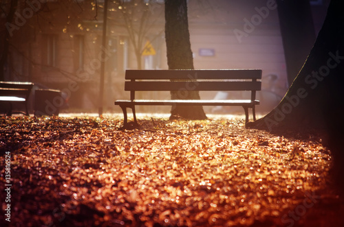 Autumn Evening Landscape With Lonely Bench Under Yellowed Trees In