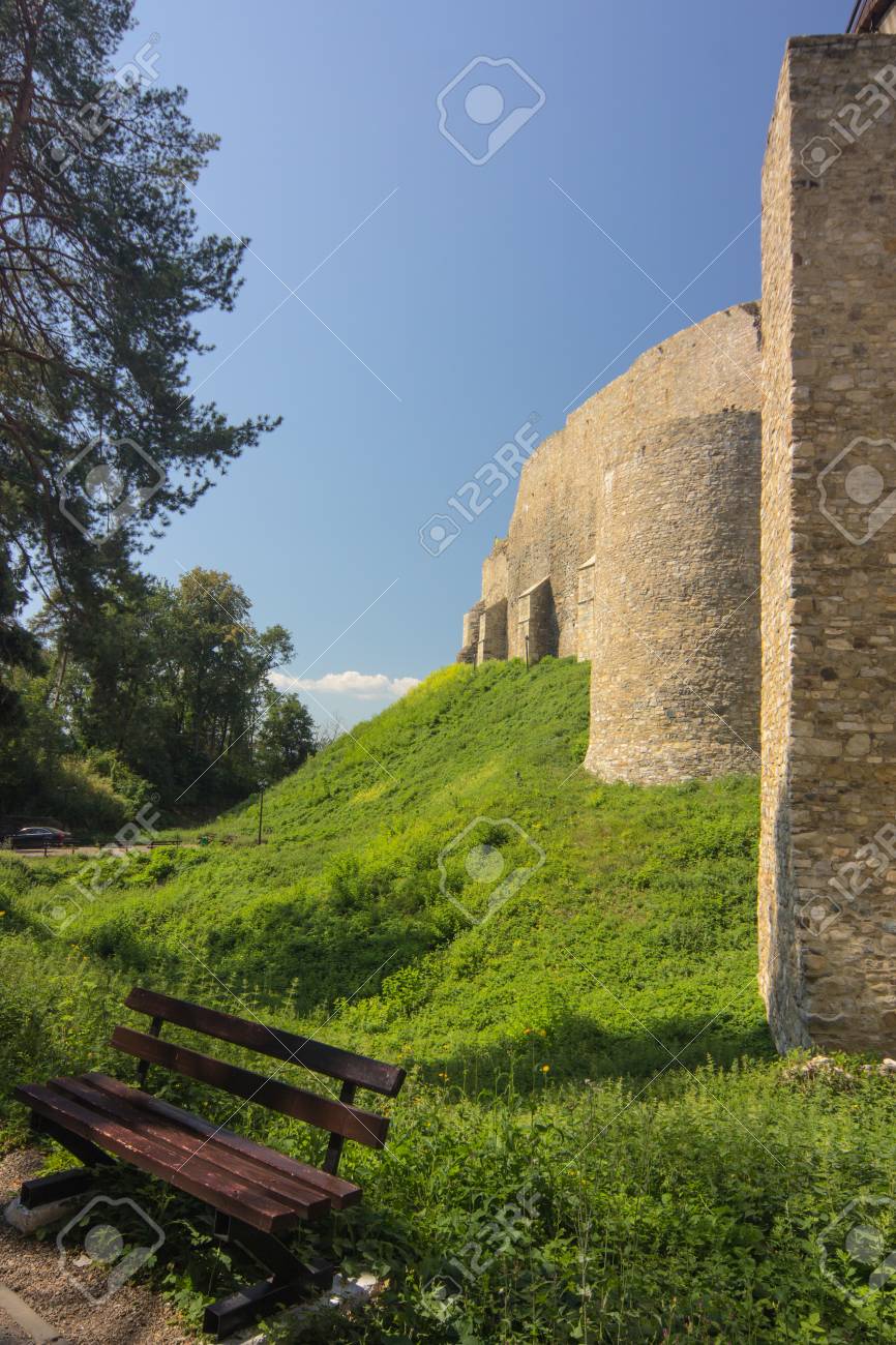 Place For Rest Wooden Bench Near Walls Of The Old Medieval Castle