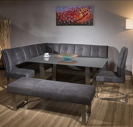 Luxury 8 Seater Grey Suede Corner L Bench Chair Glass Top Dining