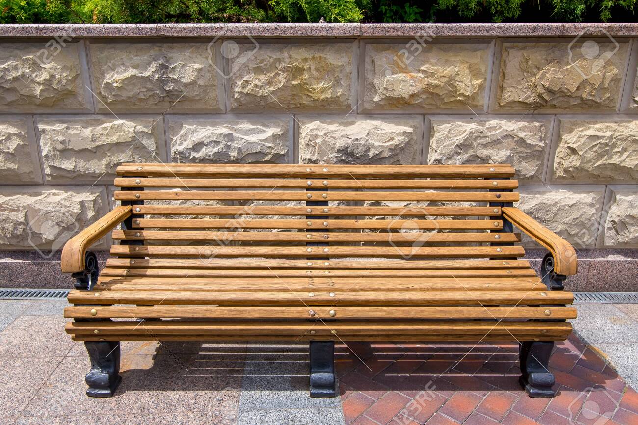 Wooden Bench With Iron Legs On The Tile And On The Stone Wall
