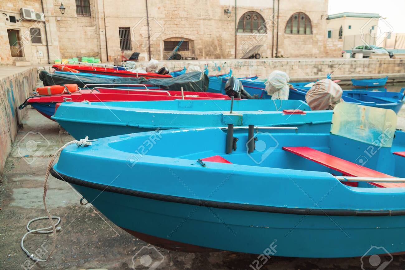 Old Blue Fishing Boats With Red Wooden Benches Rest In Port In