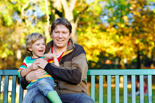 Little Kid Boy And Young Father Sitting Together In Colorful