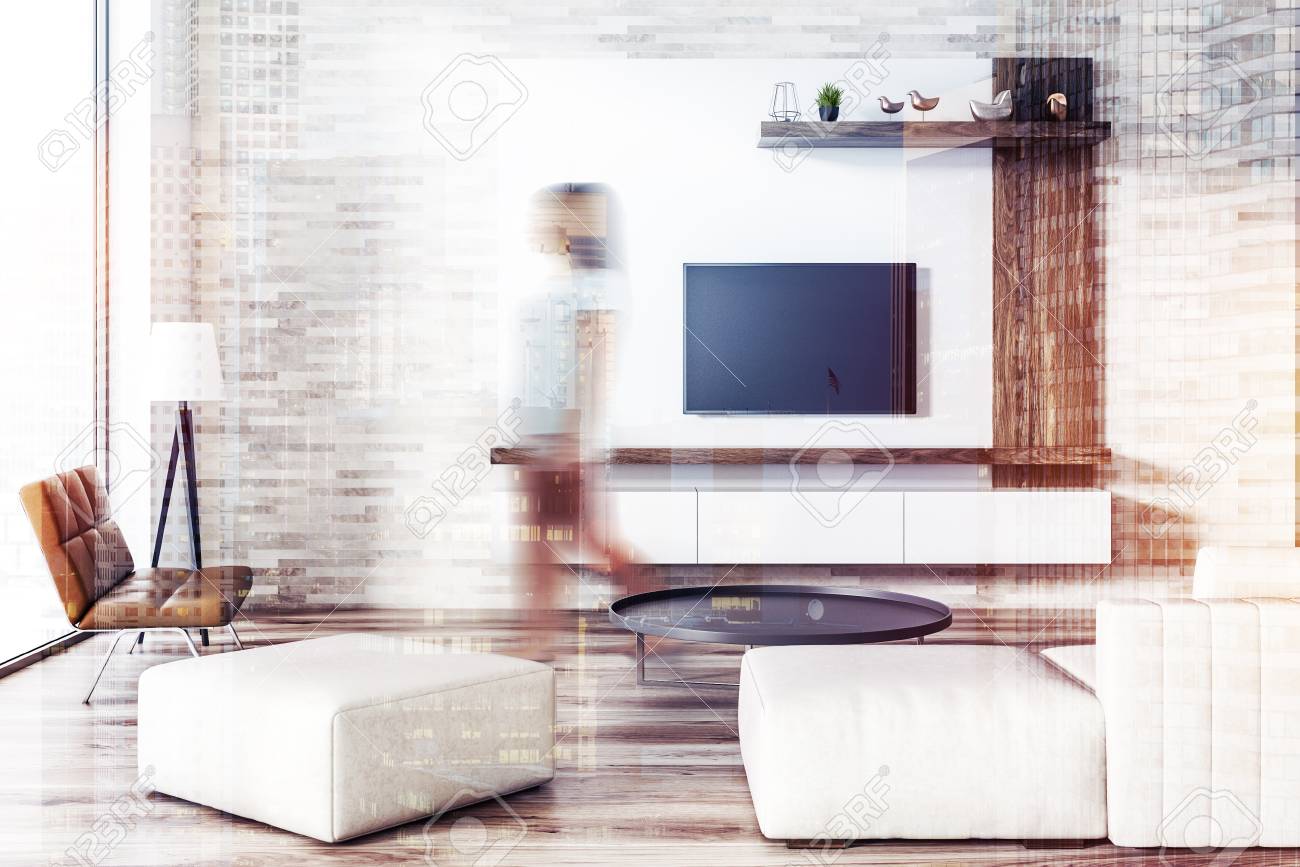 Woman Walking In Loft Living Room With Concrete Floor Sofa And