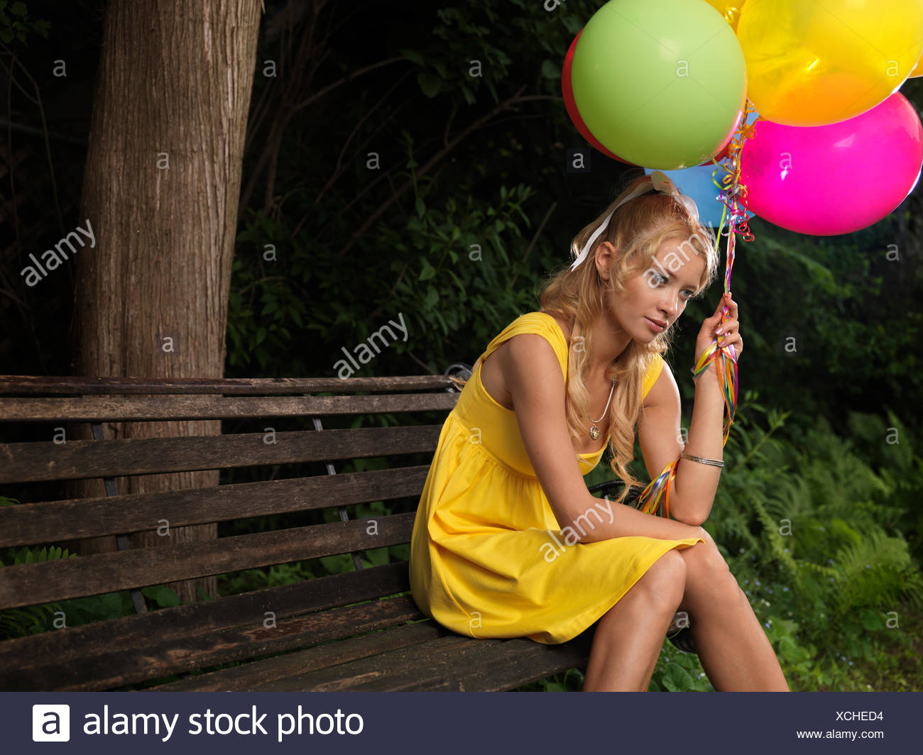 Sad Young Woman Sitting On A Bench With A Bunch Of Colorful
