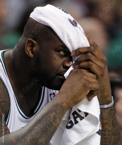 Boston Celtics Center Shaquille O Neal Watches From The Bench In